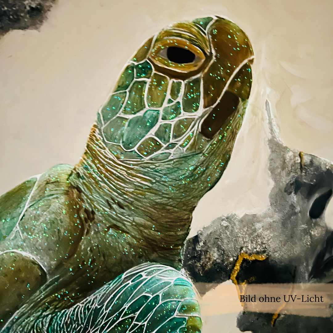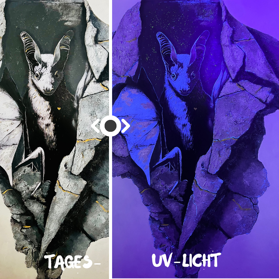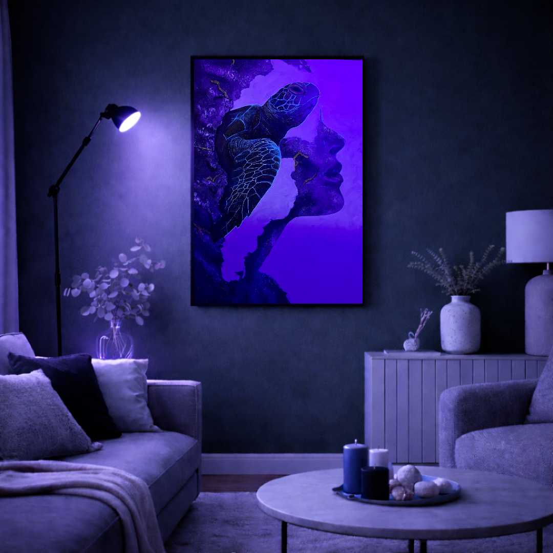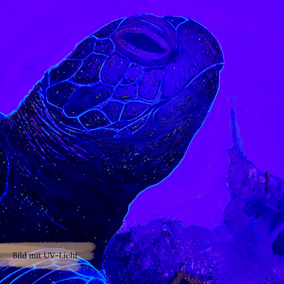 This picture was painted with neon / UV colors. It is recommended to illuminate the artwork with UV or black light. Appropriate illuminants (light bulbs, spotlights, etc.) can be purchased in specialist shops or on the Internet.