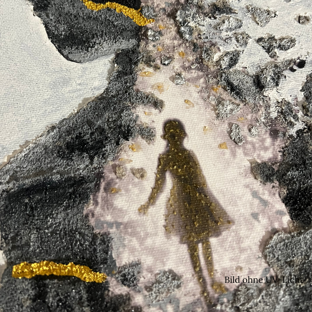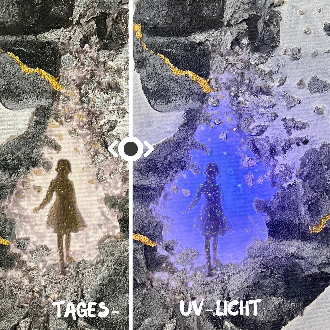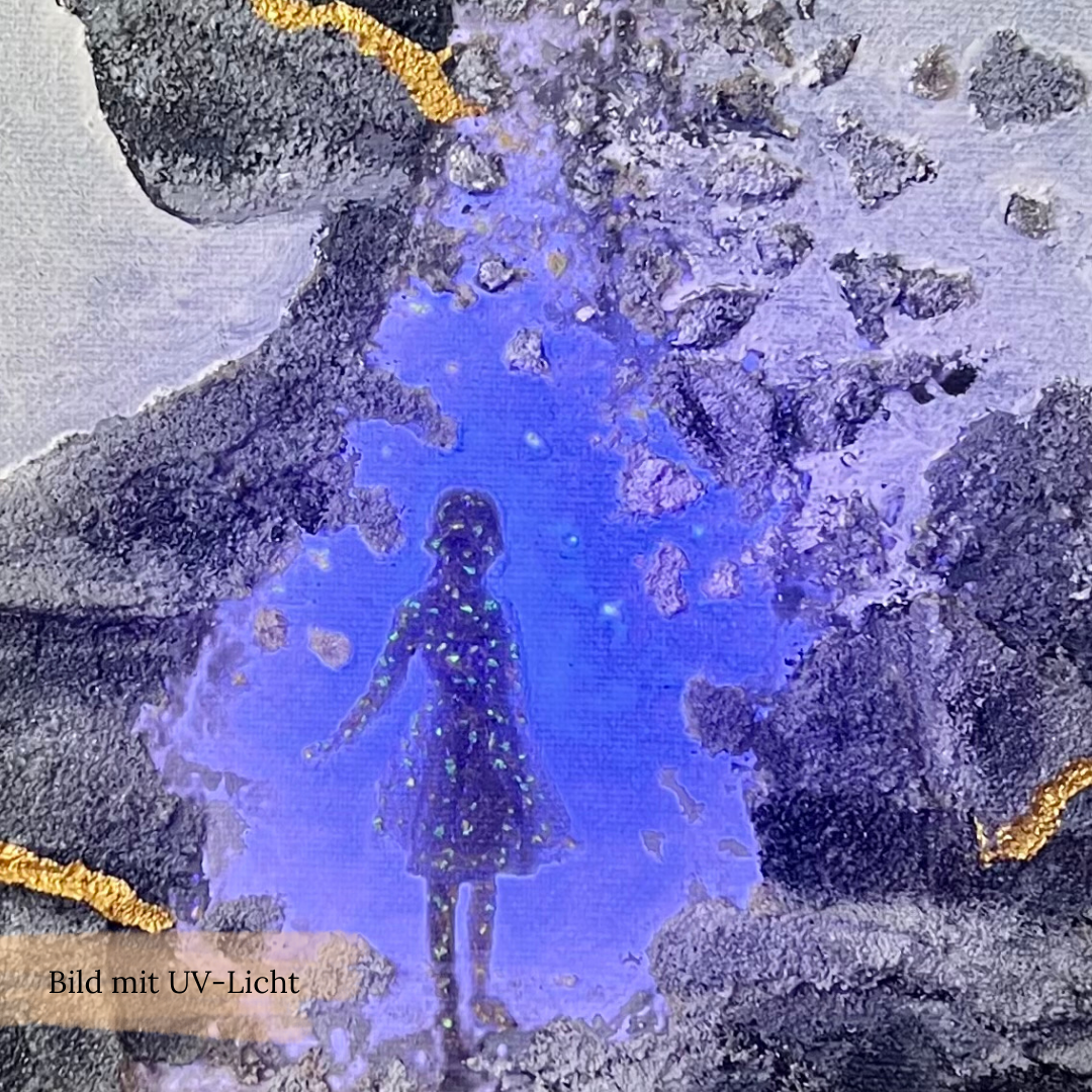Dieses Bild wurde mit Neon / UV-Farben gemalt. Es wird empfohlen, das Kunstwerk mit UV- bzw. Schwarzlicht anzustrahlen. Entsprechende Leuchtmittel (Glühbirnen, Strahler, etc.) gibt es im Fachhandel oder im Internet zu kaufen.
